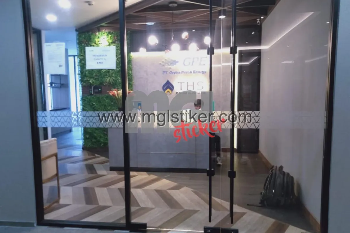 Instalasi sandblast motif/polos, kaca film gedung, dan cutting logo untuk estetika ruang kantor.